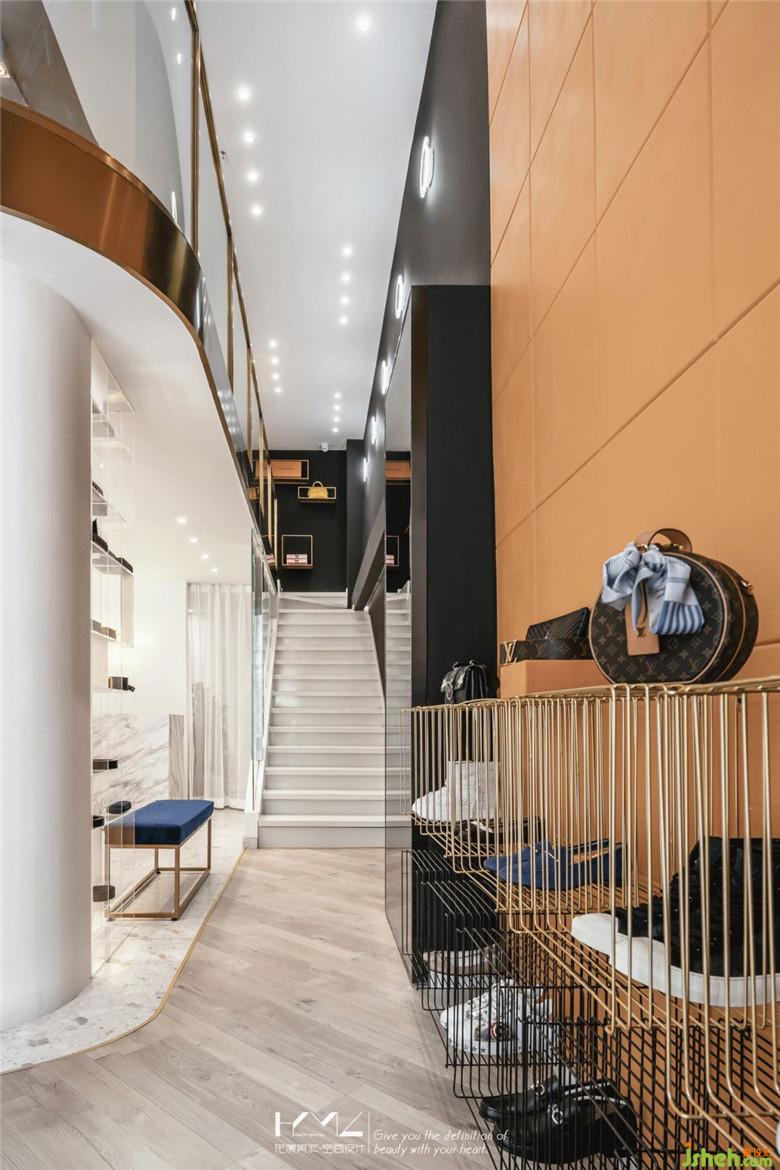 墻面為烘托橙色的主題色彩,大面使用黑色面漆,不僅使得橙色更加鮮麗,同時(shí)也更加凸顯展示空間的設(shè)計(jì)感和神秘感;二層頂部的管線,并沒有做隱藏處理,而是完全暴露,使用深灰色的面漆噴涂,更加營造了展示空間的創(chuàng)意氣質(zhì)。
