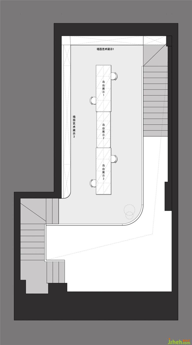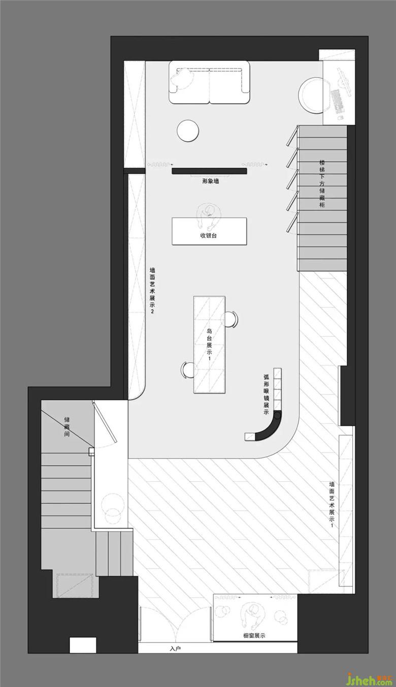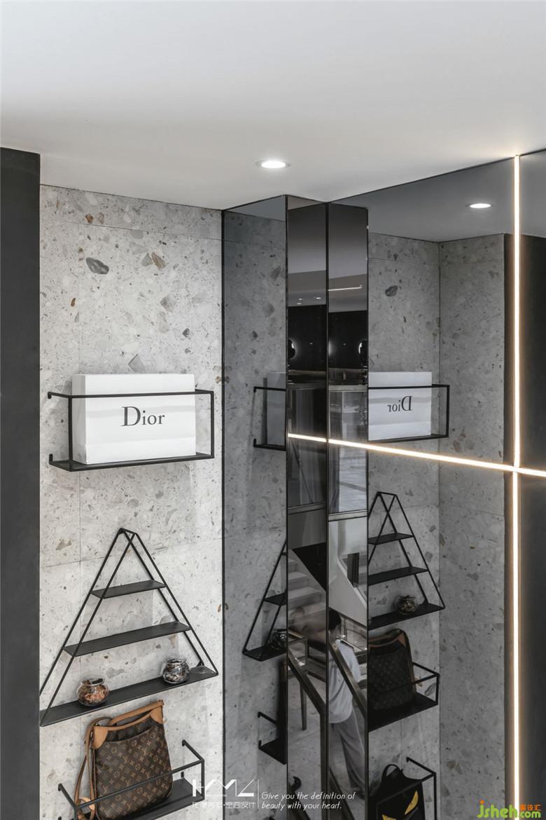 二層展架結(jié)合內(nèi)凹的墻面,裝修公司運(yùn)用透明與橙色的亞克力板,定制成品置物格,在燈光的烘托下,亞克力材質(zhì)的通透質(zhì)感應(yīng)運(yùn)而生,與展品交相呼應(yīng)。