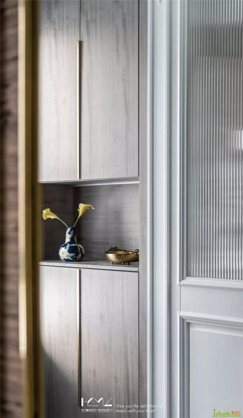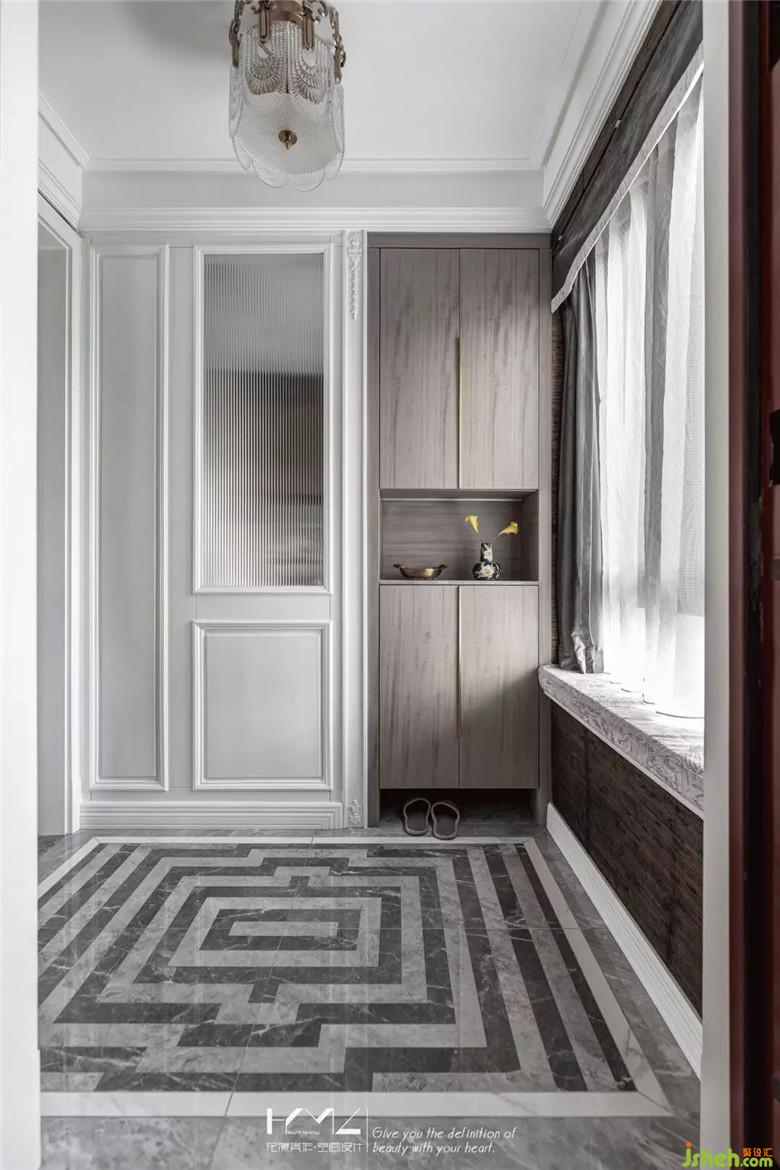 入戶門廳地面立體回紋圖形,后場切割雙拼地磚,由四塊組合而成,對面鞋柜,中層開放展架,隨手放置鑰匙和常用用品,下方懸空,方便日常更換的鞋子放置,柜門板特別選用了影木材質,質感細膩。