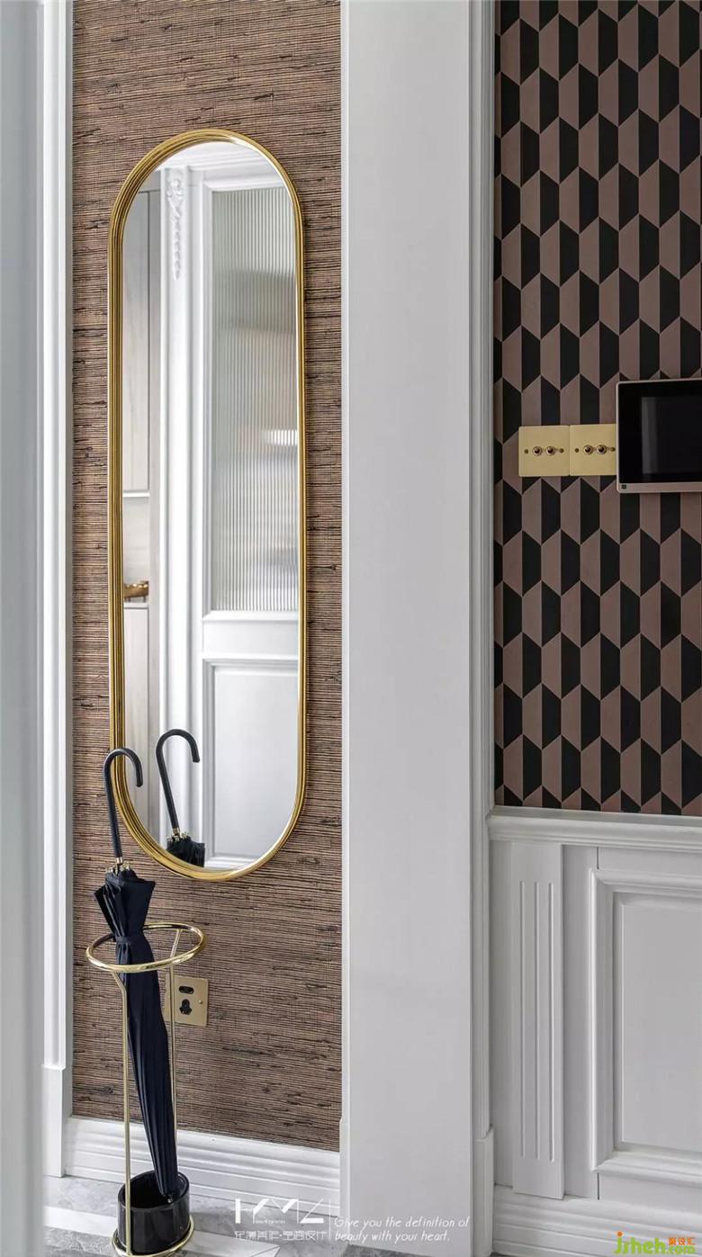 右手邊的飄窗臺面,定制軟墊,當換鞋凳使用;正對的白色護墻面與長虹玻璃結合,隱約可以看到廚房;入戶門右側,金邊全身鏡和精致的傘架組合,隨時整理儀表體態(tài),大幅鏡面,也同時拓展了入戶小空間的視覺,復古造型的頂燈,增添門廳濃郁的儀式感和莊重感。裝修公司