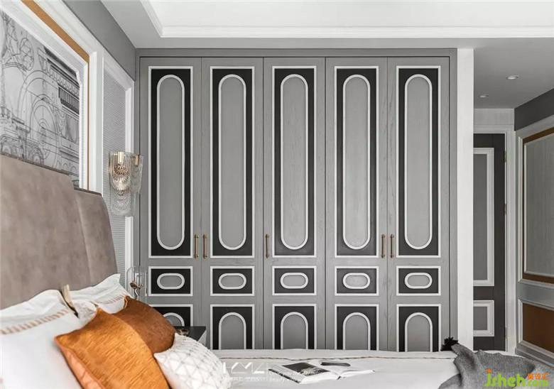 主臥衣柜柜門,與房門設(shè)計(jì)分割異曲同工,不過,柜門配色以重色為主,白色框線點(diǎn)綴,融合圓弧元素設(shè)計(jì)其中,彰顯沉穩(wěn)氣質(zhì)。