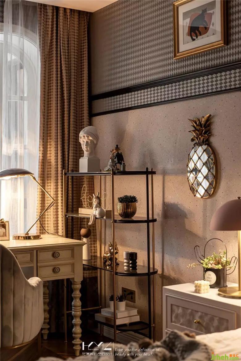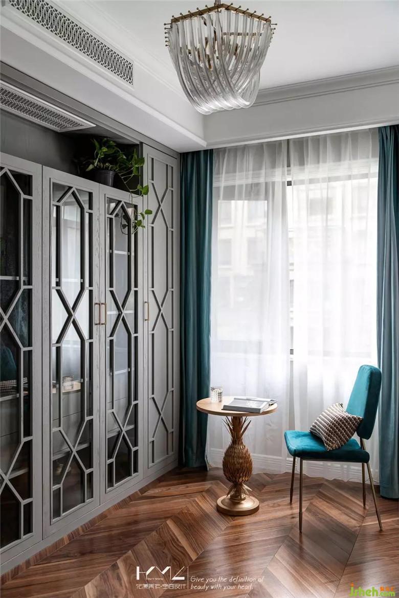 書房功能上當(dāng)做藏書與儲(chǔ)存空間存在,利用L型結(jié)構(gòu)特點(diǎn),圍合出衣帽柜和書柜組合,全部灰色顯紋烤漆飾面,柜門設(shè)計(jì)了菱形凹凸造型,衣柜與書柜利用中間鏤玻璃區(qū)分,上方的空調(diào)風(fēng)口,利用柜體設(shè)計(jì),將回風(fēng)口置于書柜上方,簡(jiǎn)約水晶吊燈,與藍(lán)色絲絨窗簾營(yíng)造輕奢氛圍。