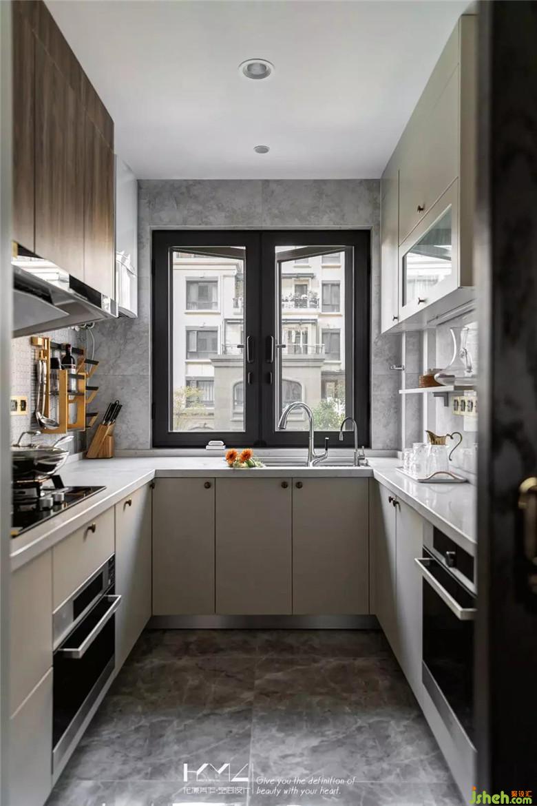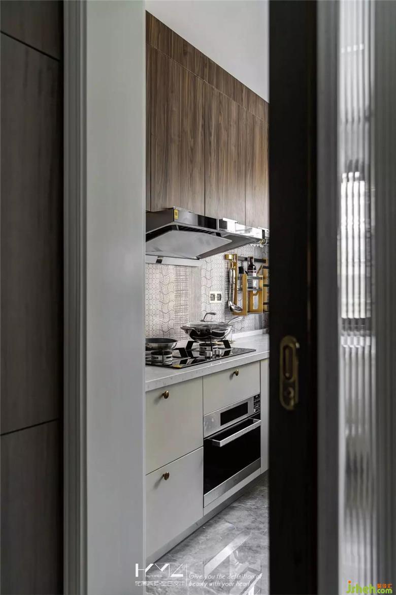 廚房呈現(xiàn)現(xiàn)代風(fēng)格,吊柜深胡桃木平板門顏色與整屋的魚骨地板類似,配亞克力把手,下柜是奶白色烤漆門板,金色把手點(diǎn)綴,灶臺(tái)的背景磚選了四色混拼花紋長(zhǎng)條磚,與南陽(yáng)臺(tái)同系列,地磚與主衛(wèi)地磚同款,廚房?jī)?nèi)的五金掛件都是黑金色,所有軟裝的選擇都透露著精致的小心思。裝修公司