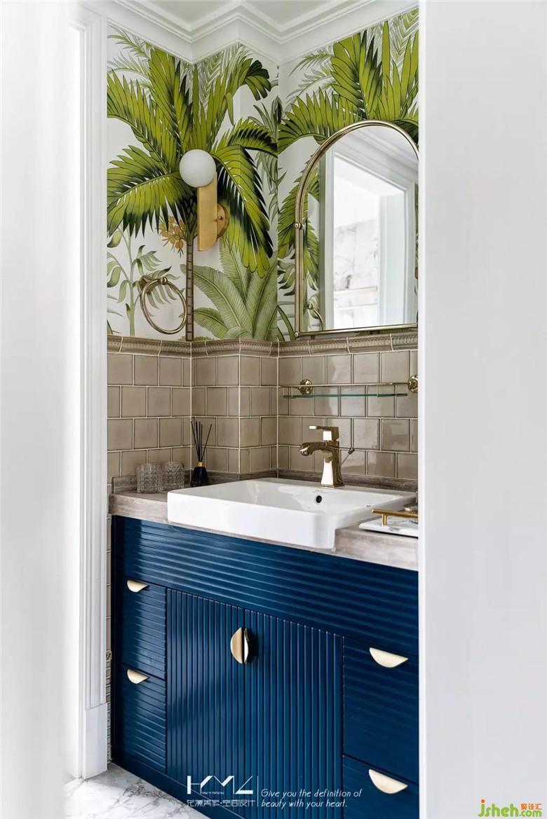 上部分是綠色系的花鳥壁紙,柜體特意調(diào)了藏藍(lán)色烤漆門板,橫向豎向的抽縫紋理讓柜門顯得獨(dú)特雅致,半圓的金色把手可愛(ài)又獨(dú)特,兩邊是金色白球壁燈。