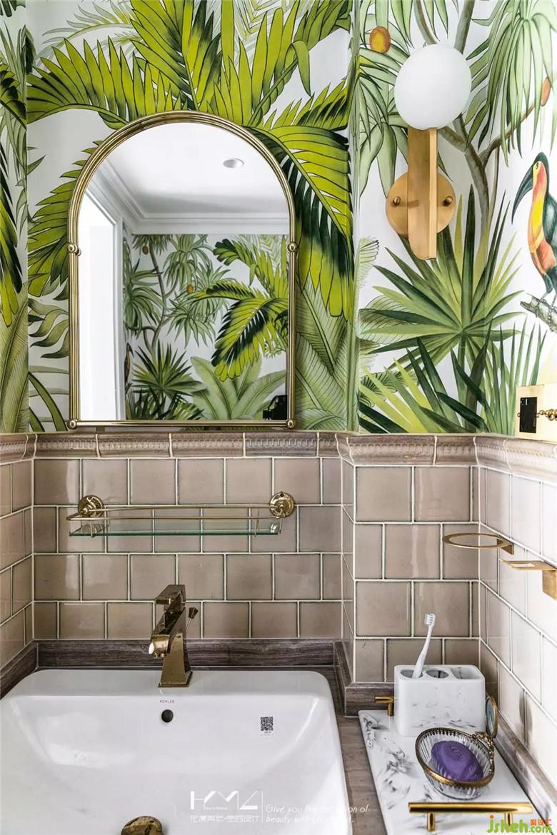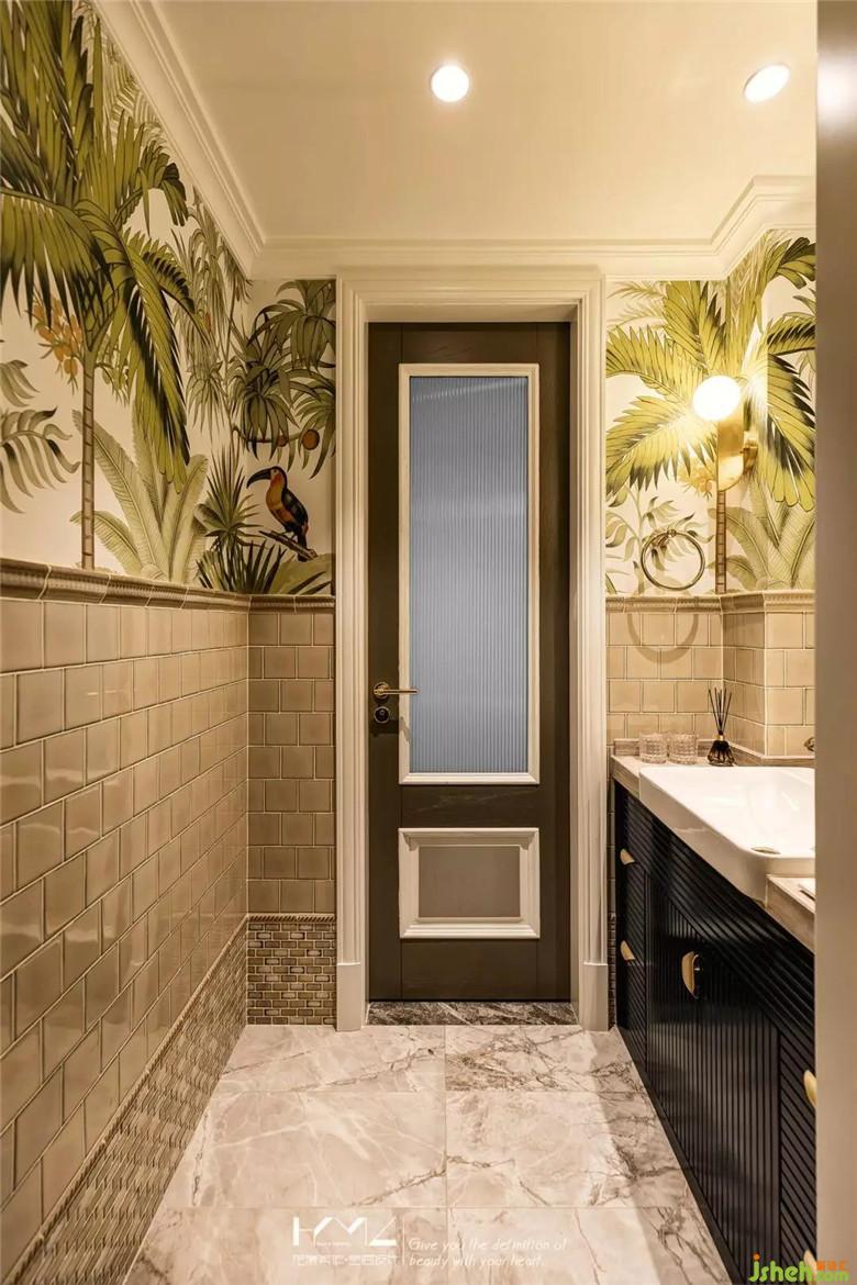 干區(qū)設(shè)計(jì)手法與主衛(wèi)相同,半高復(fù)古小磚的拼貼形成了保護(hù)墻裙,美觀易打理。