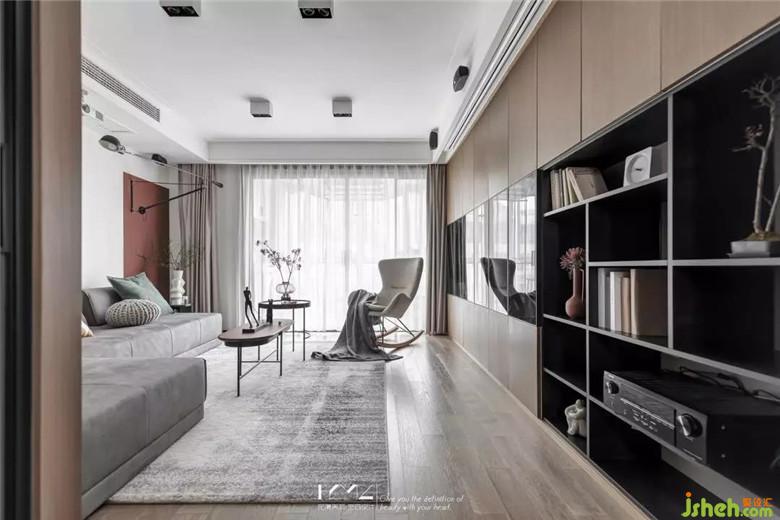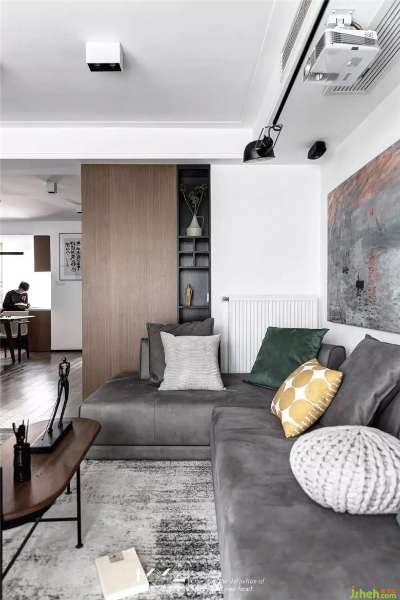 屋主一直有讀書的習(xí)慣,希望能營(yíng)造家庭讀書的氛圍,而客廳是整個(gè)家最核心的區(qū)域,讀書、藏書的功能在這個(gè)區(qū)域可以發(fā)揮的淋漓盡致。投影幕布代替電視機(jī),釋放柜體空間,整排書柜既實(shí)現(xiàn)了書籍的放置,裝修公司也解決了收納的問題。書柜的木質(zhì)柜門仿照KD板的顏色和木紋做油漆門,反復(fù)調(diào)色確認(rèn),盡可能縮小色差,統(tǒng)一木色。