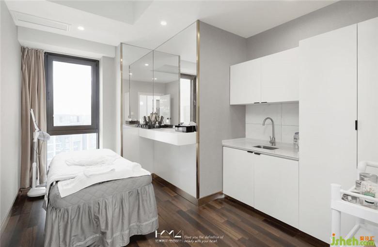 美容包間內(nèi)的氛圍營造上,運用了四種材質(zhì),無縫壁布、不銹鋼收邊條及腳線、純白色柜子、胡桃木色地板,輕柔的色調(diào)使空間氛圍恬靜柔美,同時更好的避免了客戶體驗過程中的視覺疲憊感。