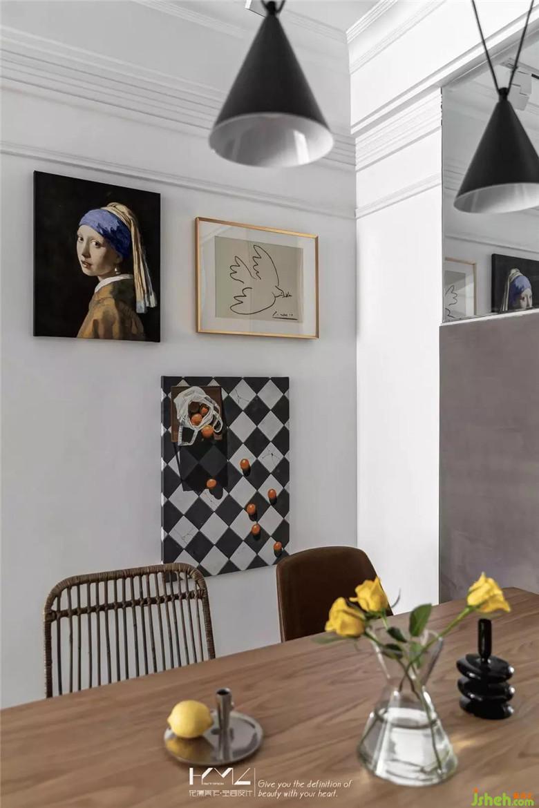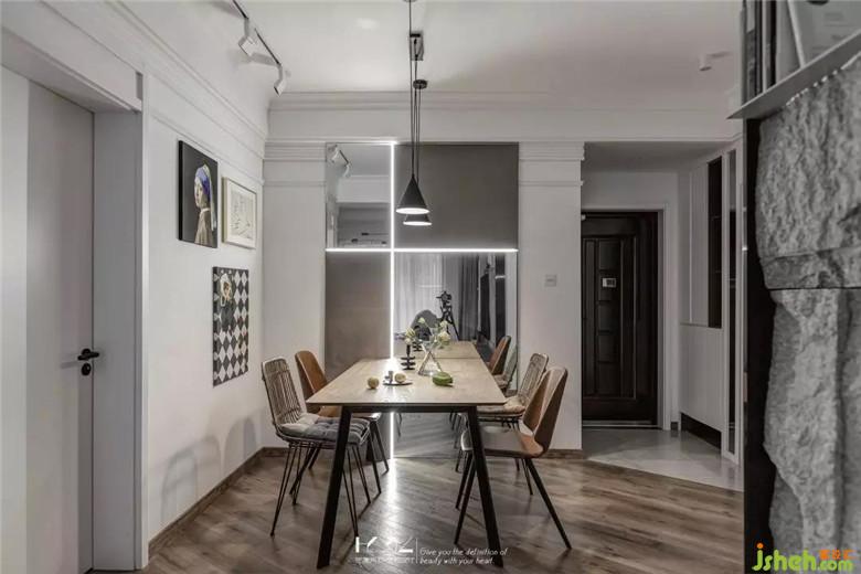 餐廳與門廳裝修公司利用了鏡面元素來擴大空間的視覺感,餐廳背景的硬包既是裝飾作用,又巧妙隱藏了強弱電箱,十字燈條增加了餐廳區(qū)域的亮度與裝飾性。入戶45度斜鋪的地板貫穿客餐廳,個性十足。