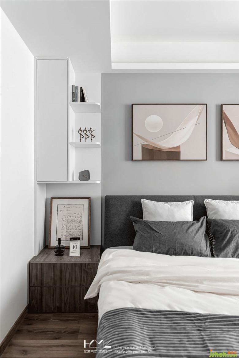 主臥整體格調(diào)偏沉穩(wěn),胡桃木的柜體、深灰色的床體和淺灰色的背景搭配白色的墻面,空間呈現(xiàn)一種簡潔、利落的清爽感,床品和床更是融為一體,素色的紋理更凸現(xiàn)空間的氣質(zhì)。