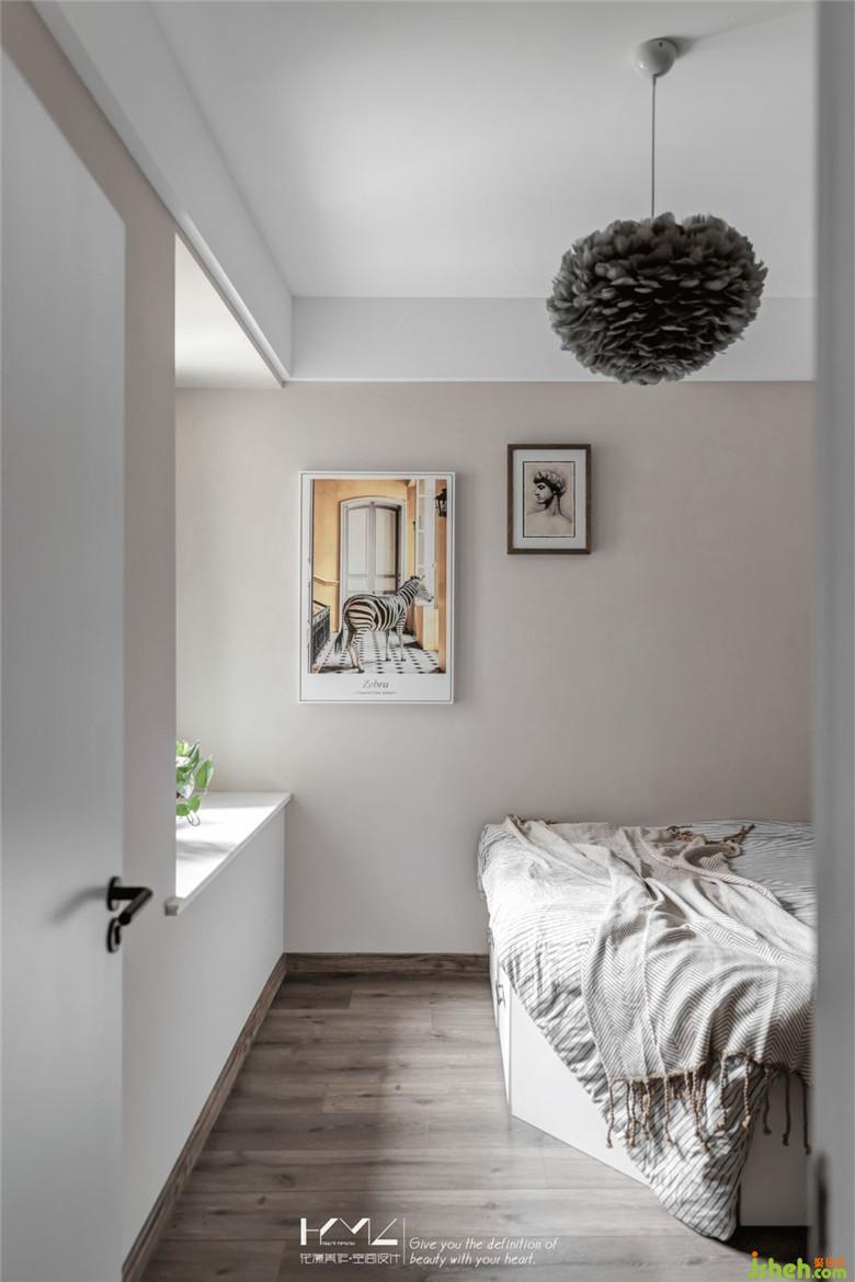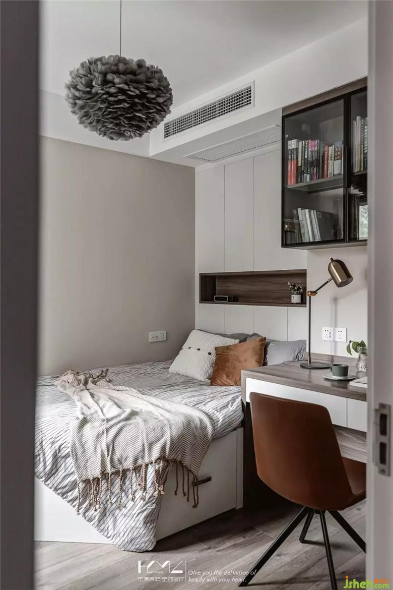 次臥裝修公司整合了睡眠、休閑、儲(chǔ)物、辦公的功能,咖色的墻面與廚房瓷磚的顏色相呼應(yīng),北歐風(fēng)的床品提升了空間的溫馨度,胡桃木色和黑色點(diǎn)綴了整個(gè)空間。