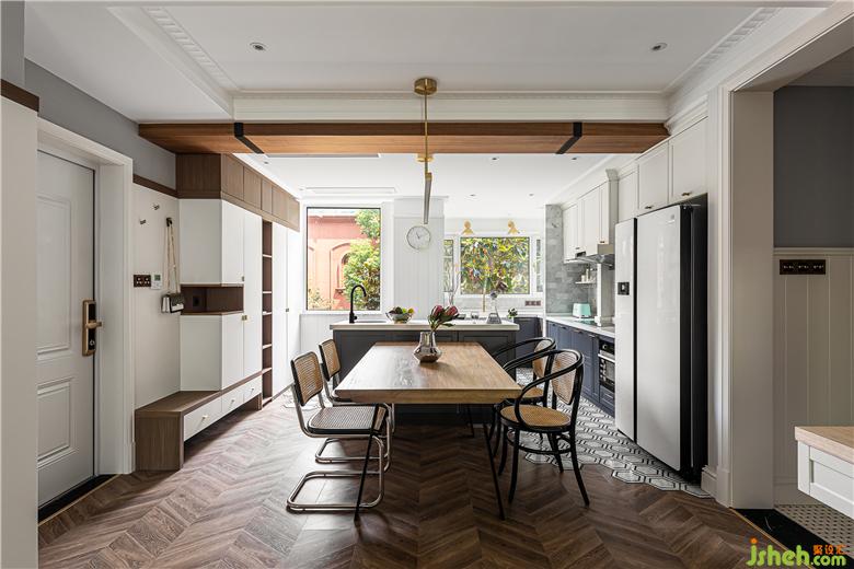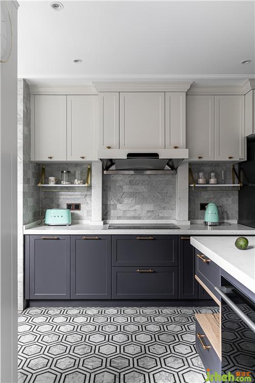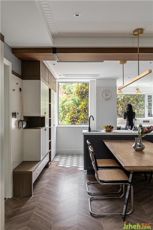 地面采取了六角磚與地板拼接的形式,利于廚房操作空間地面的打理