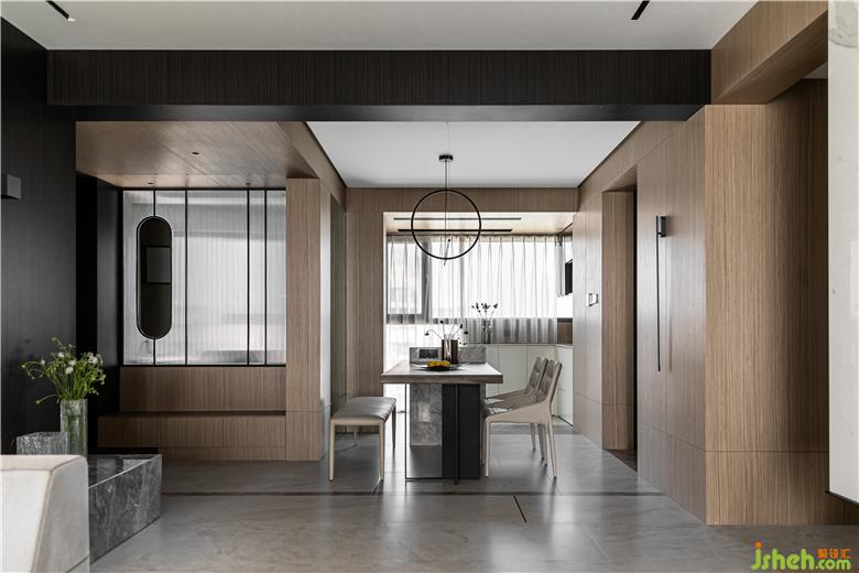 深木飾面包梁,將入戶與餐廳與過道三個區(qū)域進(jìn)行聯(lián)動,弱化空間邊界感。