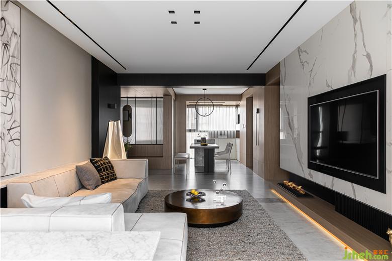 鋁框黑波飾面規(guī)避了收納的雜亂感,杭州家居裝修設(shè)計讓空間呈現(xiàn)出整齊劃一的秩序感和神秘的精致美感。
