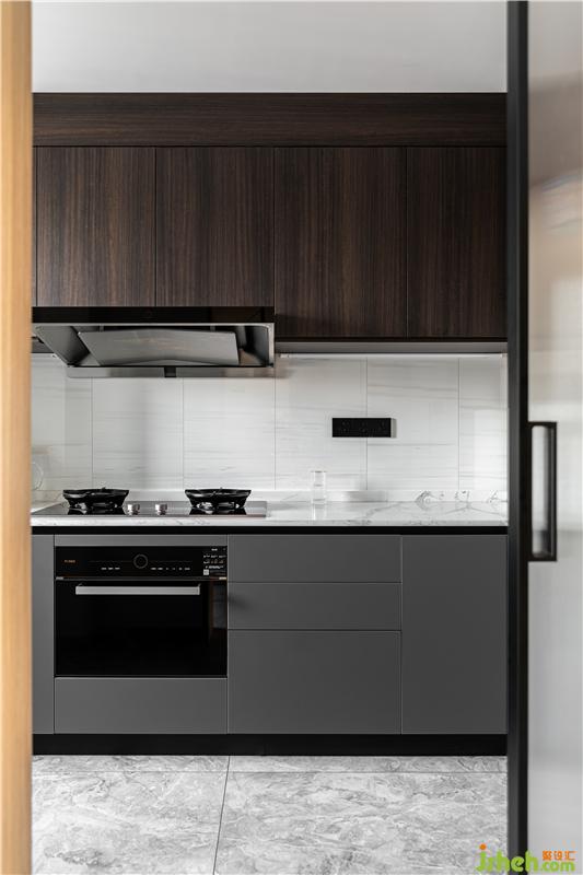廚房與餐廳相互貫通,設(shè)置暗藏玻璃移門,可大敞大開,亦可將二者區(qū)隔開來,杭州家居裝修設(shè)計每一處設(shè)計都是功能和美感上的考究。