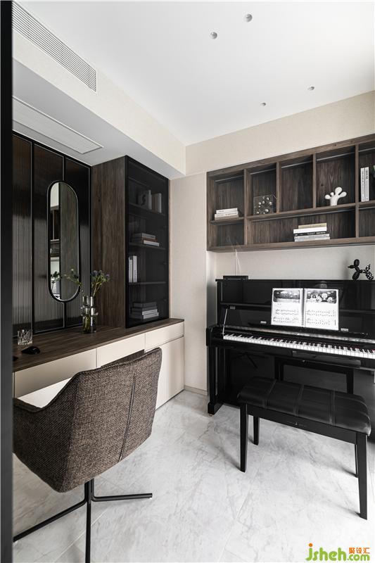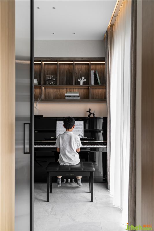 一字型雙人書桌與書柜橫豎交錯,滿足同孩子伏案作業(yè),亦能滿足獨自使用書房,鋼琴上方的開架書柜不同比例切割,蘊藏著對簡約美學(xué)的嚴(yán)謹(jǐn)思考。