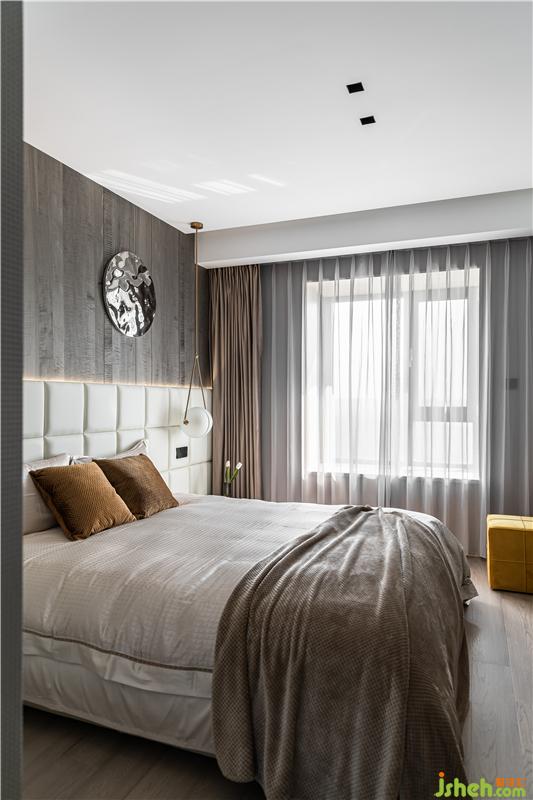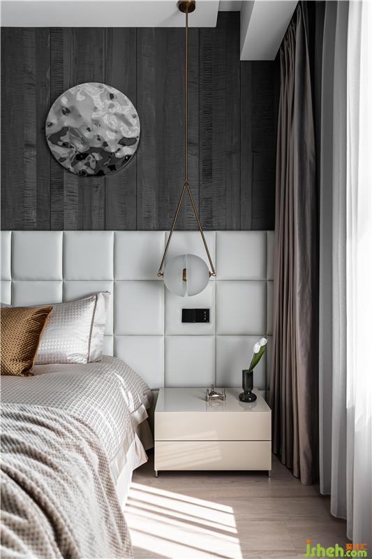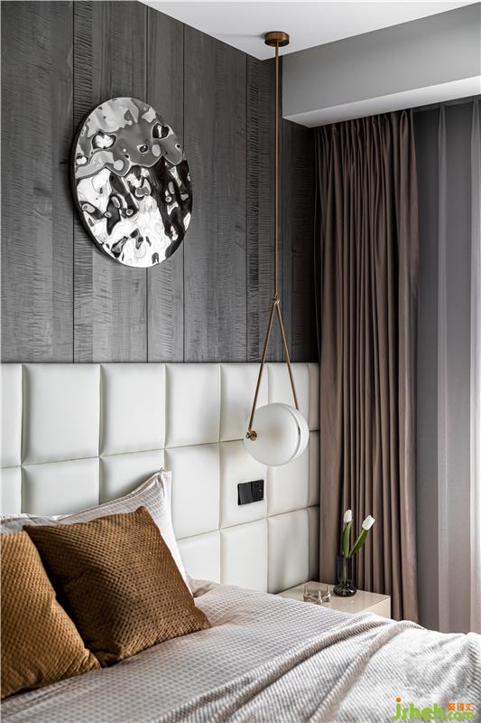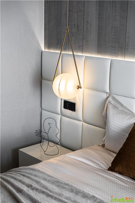 銅鈴般的床頭吊燈對稱布置,水波紋裝的圓盤裝置提升了整體品質(zhì)與美感,安寧靜謐的氛圍不期而至。
