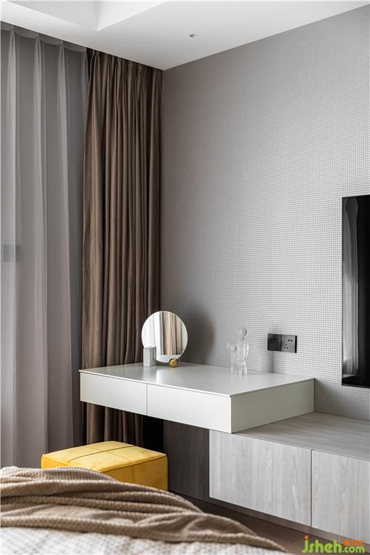 梳妝臺一側(cè)的收納及布置收放自如,主人獨有的品味以及工藝本身的魅力皆在柜子細(xì)致的劃分中悄然流露。
