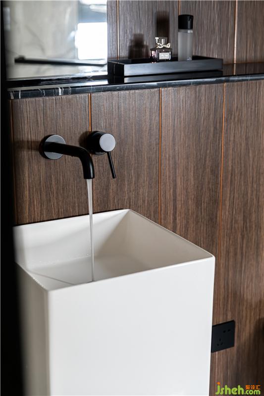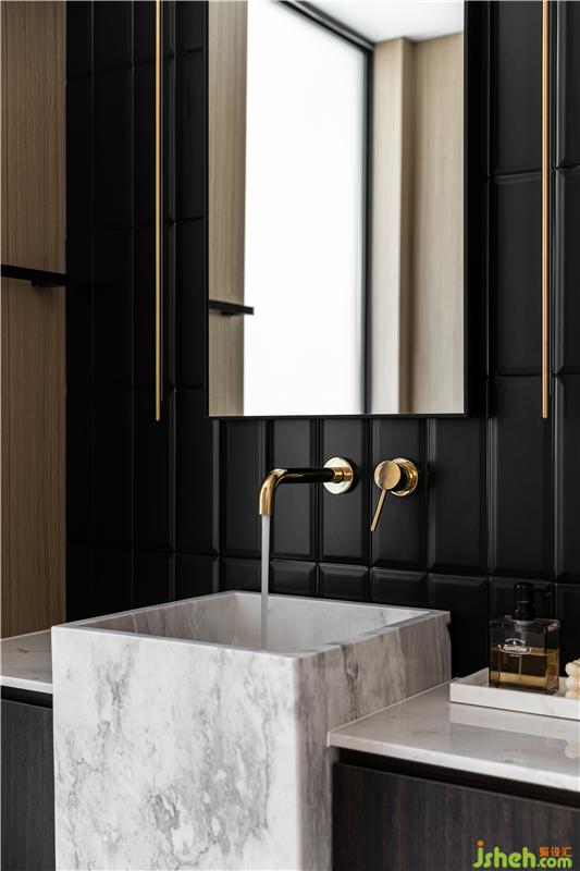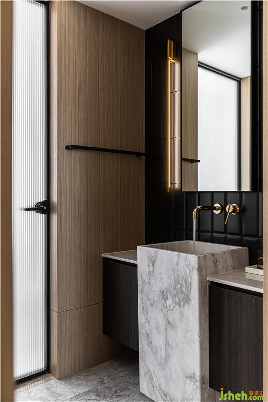 木飾面整體包裹,正面內嵌的長條方塊啞光磚,與亮銅壁燈的對稱布局,光影的折射、隱約的紋理,籠罩出一種包容之感,極具視覺張力,暗黑中的優(yōu)雅,更加耐人尋味。