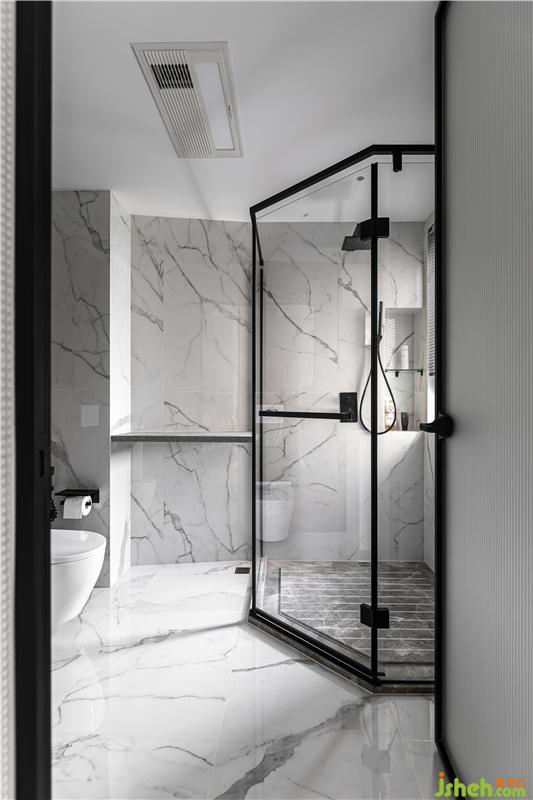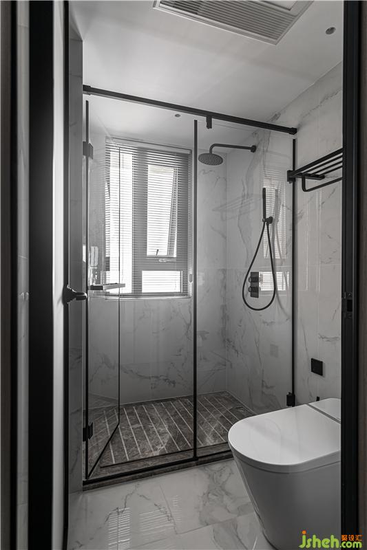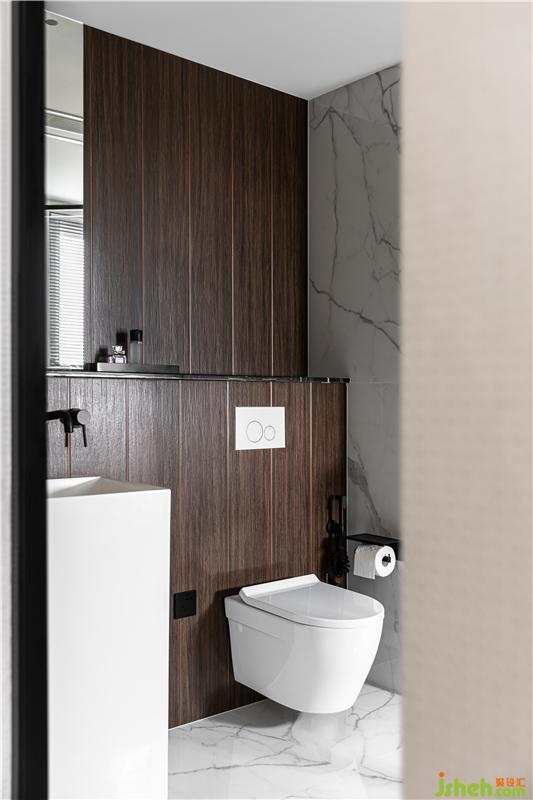 設計師同樣注重精準材料推敲,木紋磚與黑色石材的拼接,立柱盆與墻排馬桶錯落布置,無框銀鏡內藏了強大的收納功能,門背后預留了大量的收納區(qū),小空間的立面收納運用到極致。