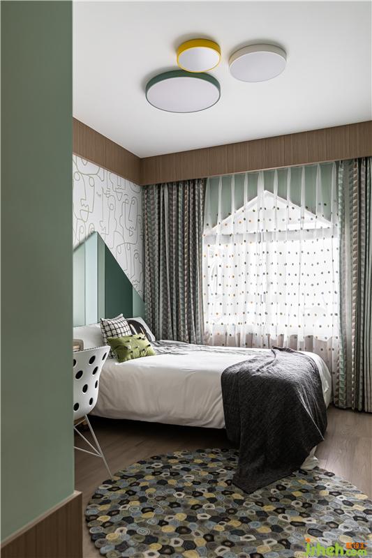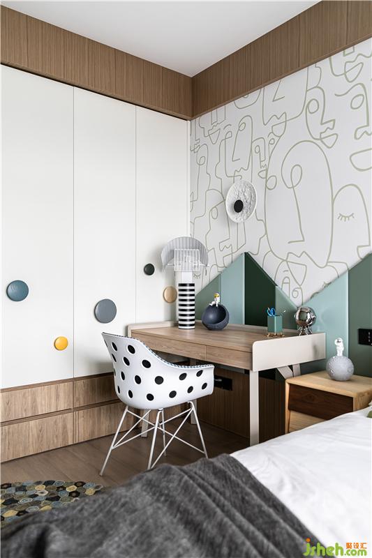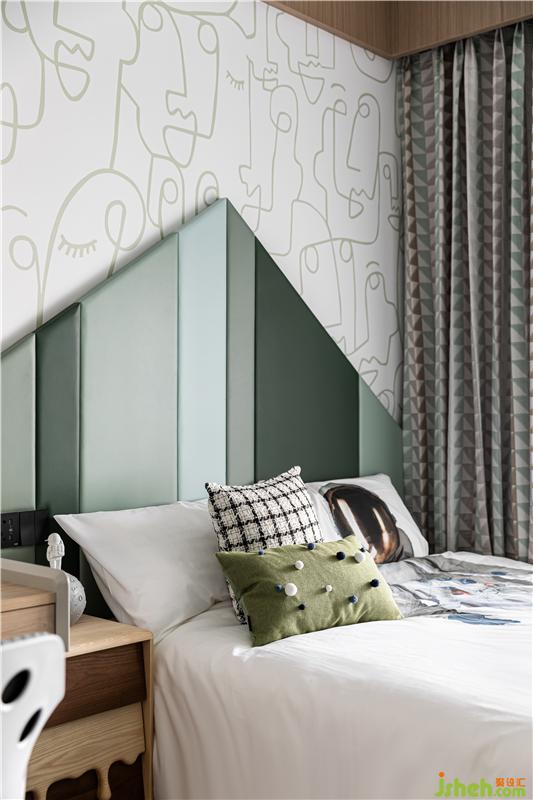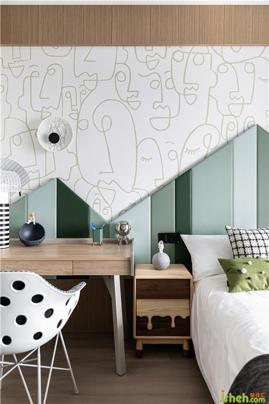 杭州家居裝修設計為小主人打造了獨立個性的臥室,特別定制的四色硬包拼接,運用房屋造型勾勒趣味邊框,木飾面的運用沿著頂順著墻、為陪伴入眠創(chuàng)造了溫馨的氛圍。