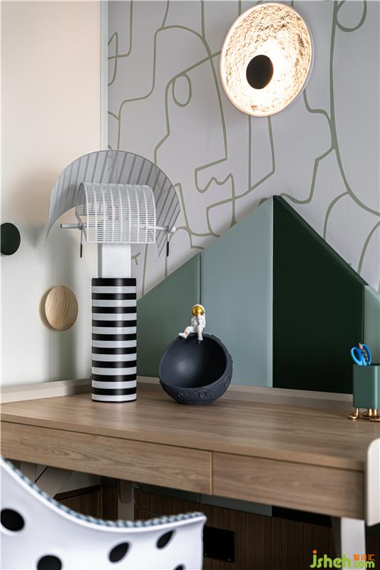 太空人的元素造型巧妙運用到擺件,床品,掛飾,燈飾等等……就像是一個太空樂園,為孩子的成長環(huán)境增貼了不少趣味性。