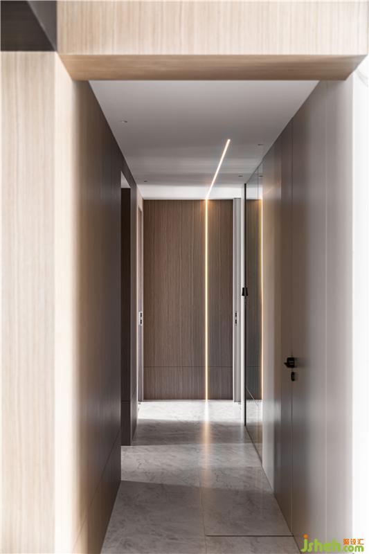 廊道的設(shè)計(jì)同樣拒絕繁復(fù),木飾面的轉(zhuǎn)折,玻璃鏡面的破切,線性燈延伸勾勒,顯得松弛又充滿韻律感。