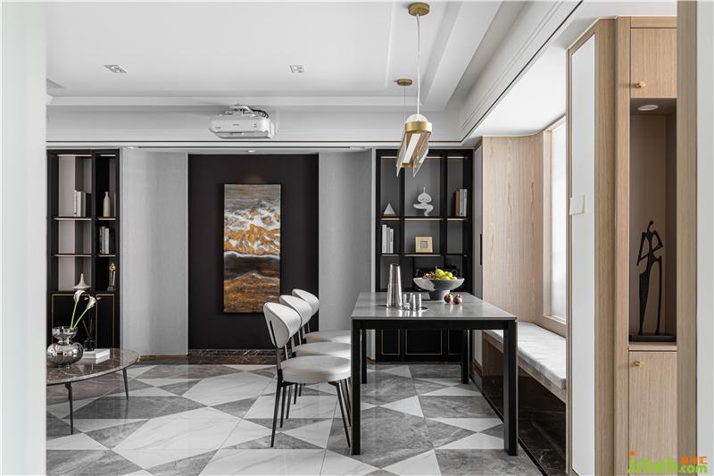 Unconventional arrangement of the guest dining room weakens the function of THE TV. The owner hopes more space for activities and learning. When the door is opened, the complete modeling background wall and hidden projection screen can be seen to meet the accidental movie-watching needs of the family. The background of the booth in the dining room is connected with the room, and the transparent changhong glass is used to bring sunshine into the dining room. The changhong glass and the curtains in the room also better ensure the indoor privacy.