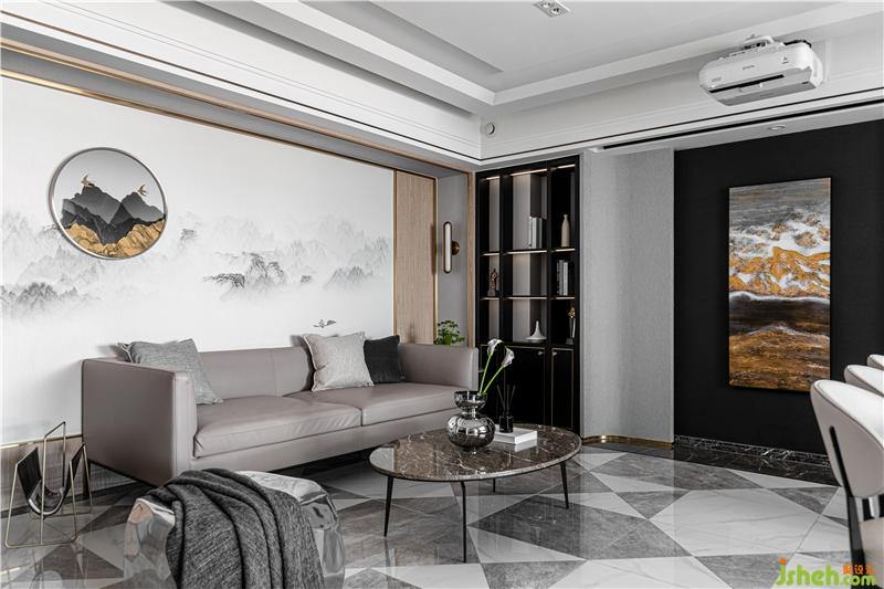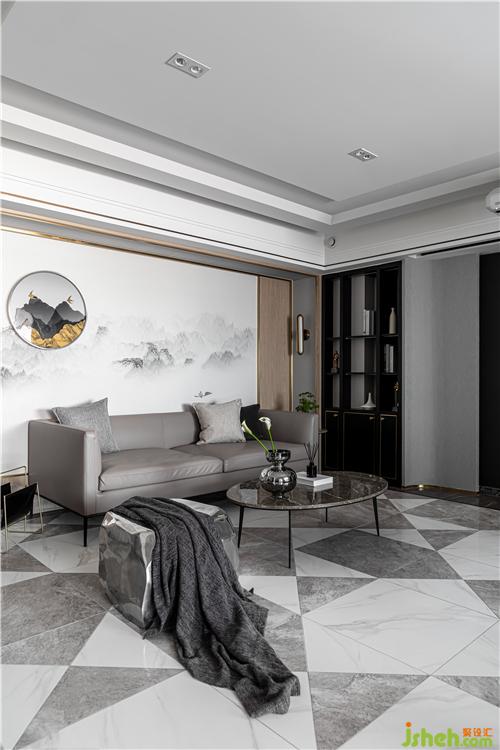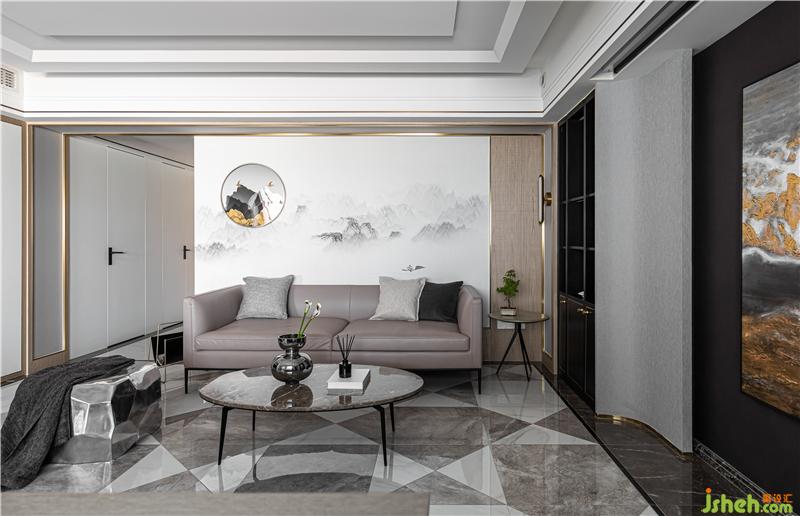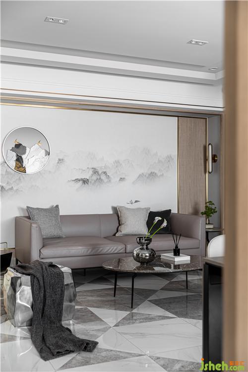 客廳背景室內(nèi)設(shè)計(jì)師采用淡淡的中式水墨壁畫,讓柔和的山水與棱角分明的地磚對比更加強(qiáng)烈.