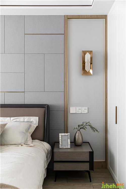 灰色硬包背景排列組合,在白色與溫潤木質(zhì)鋪陳的空間基調(diào)下,加以細(xì)線條的黃古銅點(diǎn)綴,大氣婉約之中,盡顯質(zhì)感.