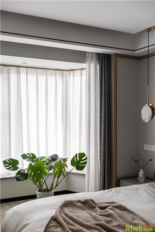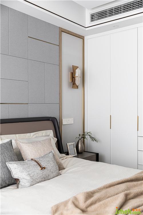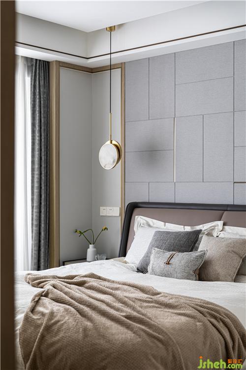 與客餐廳同系列的木飾面與金屬線條,延續(xù)到主臥空間.