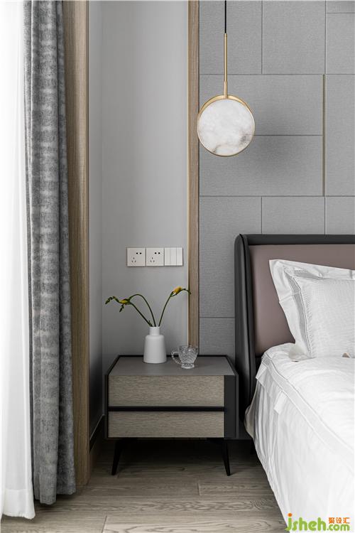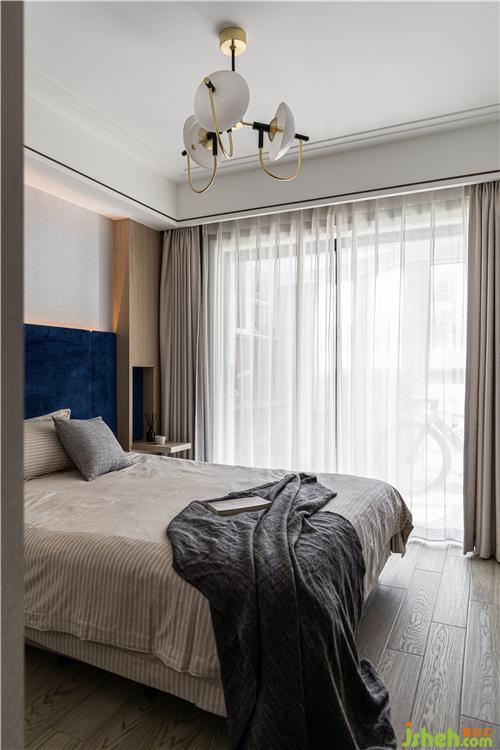 深藍(lán)色硬包背景替代傳統(tǒng)床頭靠背,與木質(zhì)挑板穿插聯(lián)結(jié),營造出獨(dú)特而不張揚(yáng)的平衡之美.