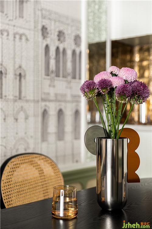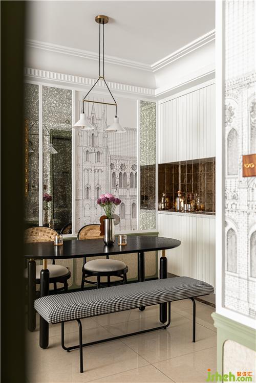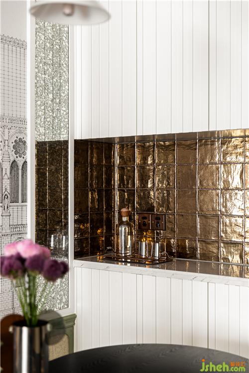 入戶右側(cè)乳白色餐邊柜搭配金屬釉面磚,個(gè)性又復(fù)古.