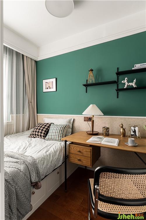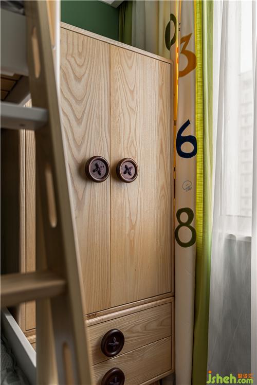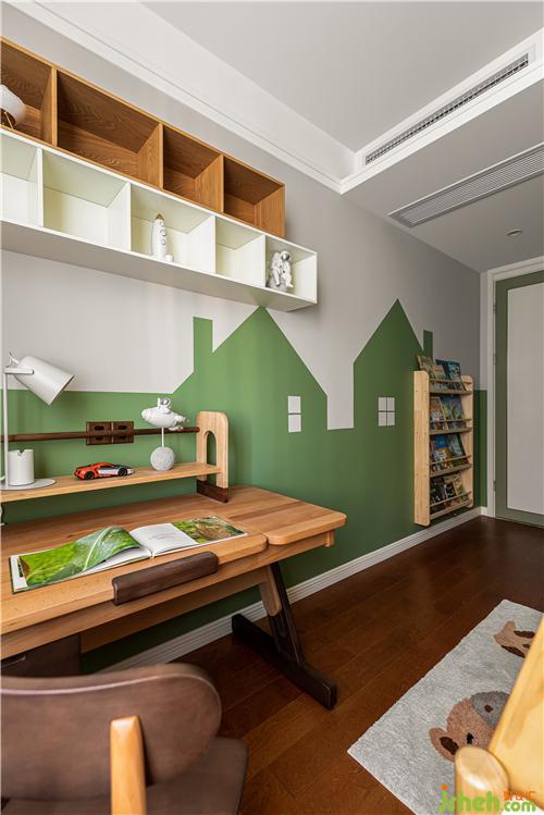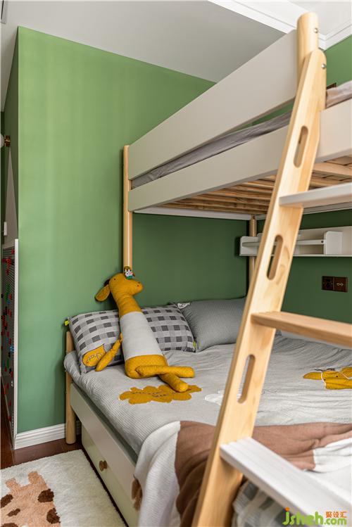 The high wall at the entrance to the children's room is for children to play and exercise their hands-on skills.The green house painted on the wall is meticulously designed.The wood-colored furniture is designed with rounded corners to ensure the safety of the children.Green space soft and hard outfit collocation is full of children's fun, jump off the yellow and orange to enrich the color of the space.
