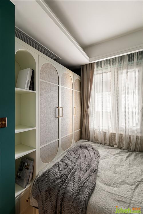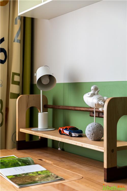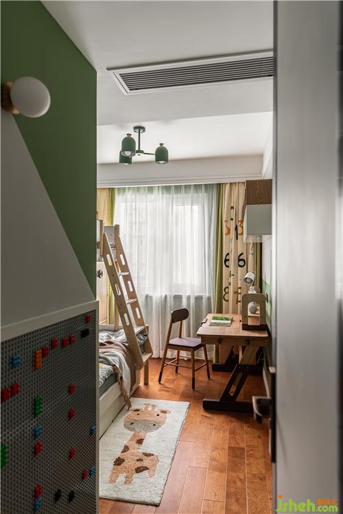 兒童房入口的樂高墻供孩子玩耍,鍛煉孩子的動手能力,墻上涂刷的綠色房子造型為精心設(shè)計,原木色的家具皆為圓角設(shè)計,保證了孩子的安全,牛油果綠色調(diào)的空間軟硬裝搭配充滿童趣,跳脫的黃色與橙色豐富了空間色彩.