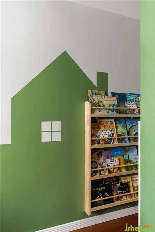 房子造型的墻面與兒童書架趣味結(jié)合.