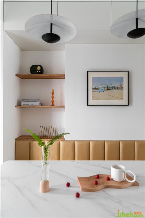 利用廚房轉(zhuǎn)角的承重柱,做了一個(gè)小吧臺(tái),既是廚房臺(tái)面的一個(gè)延伸,又滿足了早餐桌的功能.