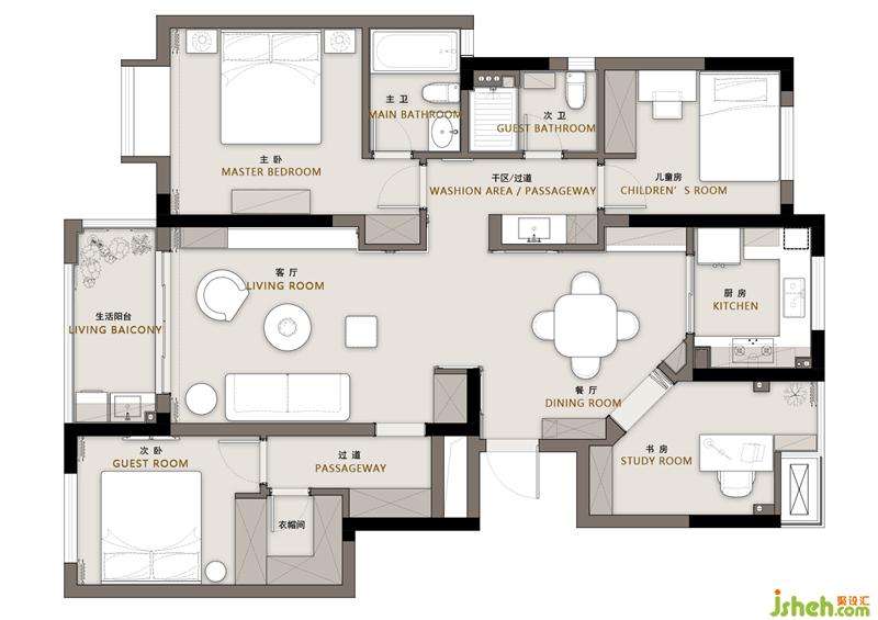 1. 取消入戶門廳,書房內(nèi)退,空間劃入餐廳,擴大餐廳空間的同時削弱入戶的局促感.