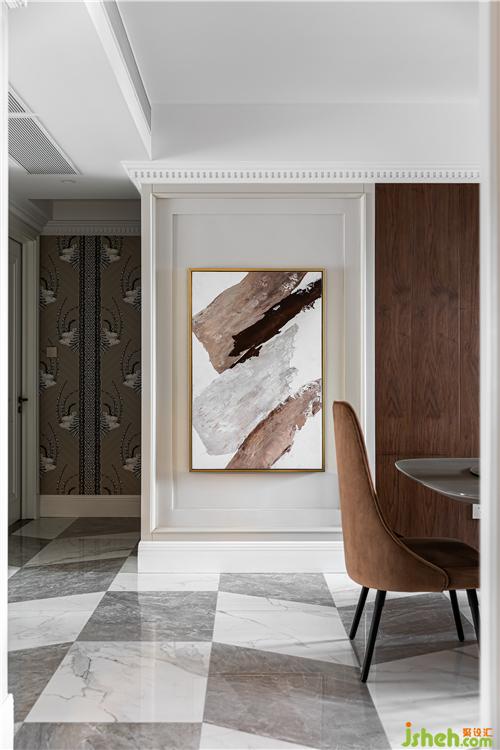 推門入戶,一幅大地色油畫呈現(xiàn)在眼前,與犀牛墻紙、奶茶色護墻、胡桃木飾面、餐椅絨面交相呼應(yīng),給人沉穩(wěn)、和諧、溫暖的舒適感;地面灰白石紋瓷磚異形拼接,摩登感十足,呈現(xiàn)出理性棱角與溫潤色調(diào)的沖突之美.