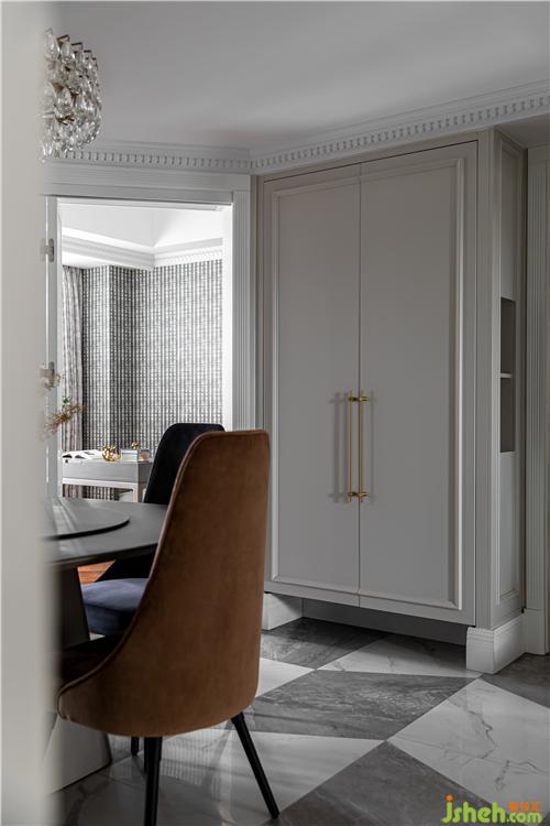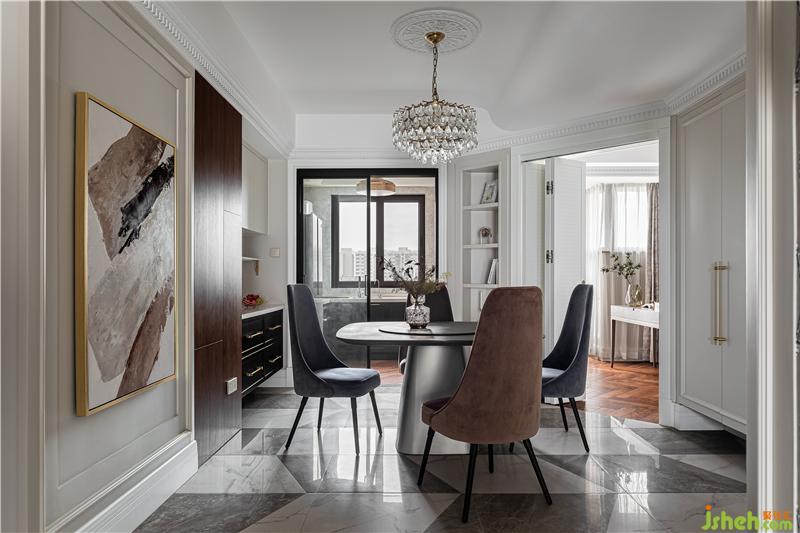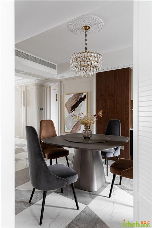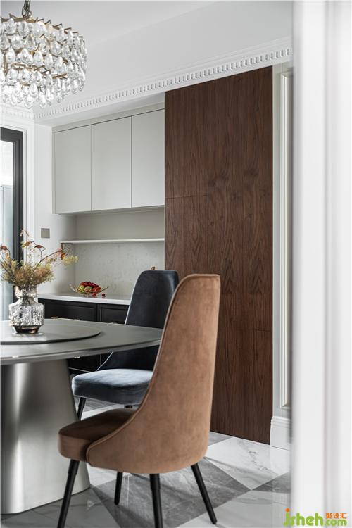 餐廳是推門入戶的第一視角,整體想要營造出一種精致優(yōu)雅的輕復(fù)古風;PU線條、疊級護墻、高踢腳與胡桃木飾面碰撞融合形成餐廳的主背景,也構(gòu)建出了整個客餐廳的主旋律;石膏燈盤、水晶吊燈、黃銅支架和黃銅拉手等一系列經(jīng)典的美式元素,與簡潔摩登造型的家具融合,既復(fù)古又時尚.
