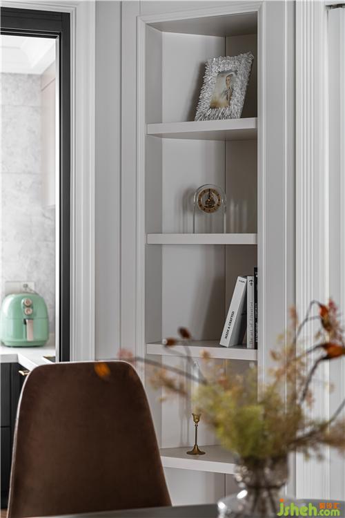 鞋柜延用護墻的造型線條,高踢腳部分挑空,便于臨時存放鞋子;側(cè)面設(shè)置開放格,進門物品可隨手放置.