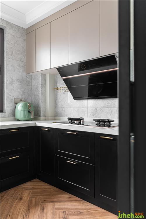 廚房地面采用胡桃木色木紋磚,地柜延用餐邊柜的黑色烤漆門板,點(diǎn)綴黃銅拉手;香檳色吊柜門板增添幾分時(shí)尚與溫馨.