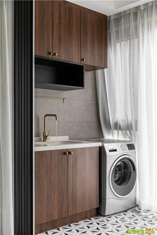 陽臺配色上也和整體統(tǒng)一和諧,胡桃木色門板、黃銅五金、水泥灰磚、六角花磚,處處透露著精致細(xì)節(jié).