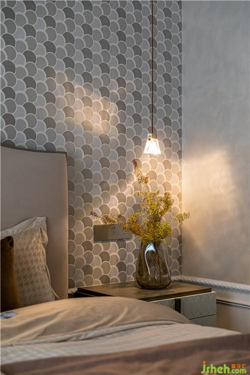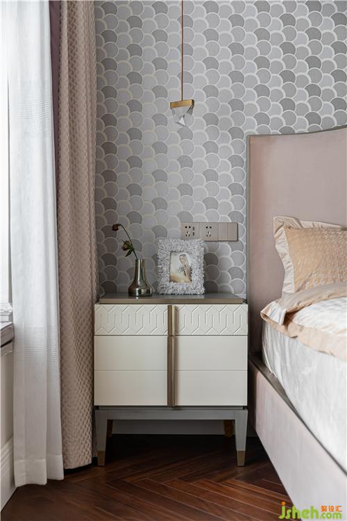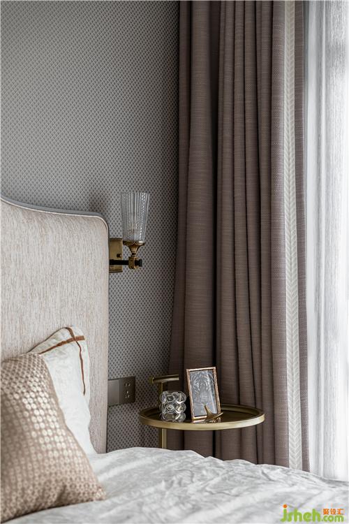 次臥整體淺咖色調(diào),格子肌理墻布與亞麻材質(zhì)窗簾盡顯細膩質(zhì)感.