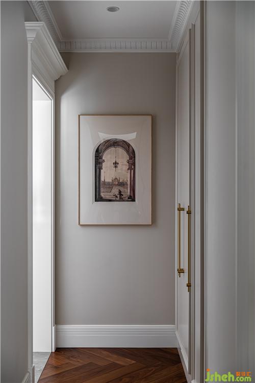 過道室內(nèi)設計師挑選了一副意大利風景畫家卡納萊托的作品《柱廊》,畫中的古羅馬柱與門套的簡化版羅馬柱相映成趣,復古又應景.