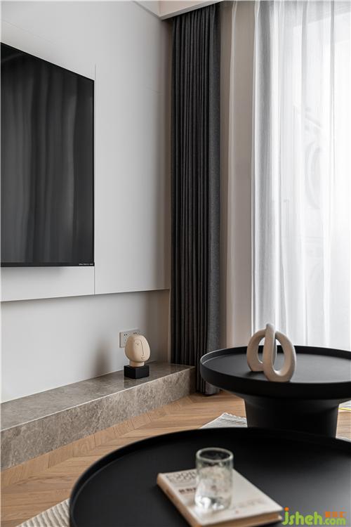 電視背景墻一端設(shè)計(jì)了一組開架與收納柜,錯(cuò)落的功能搭配與材質(zhì)沖擊削弱整面墻的壓抑感;定制的木色花盆與長(zhǎng)虹玻璃隔斷打破背景單一性,創(chuàng)造視覺上的呼吸點(diǎn)室內(nèi)設(shè)計(jì)師.