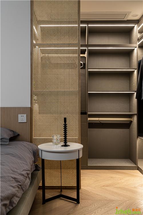 極簡圓形床頭邊幾和沉穩(wěn)簡約的藤編隔斷組合,產(chǎn)生了材質(zhì)、色彩與線條的對比,最平常的局部小景因室內(nèi)設(shè)計師混搭手法而變得有質(zhì)感.
