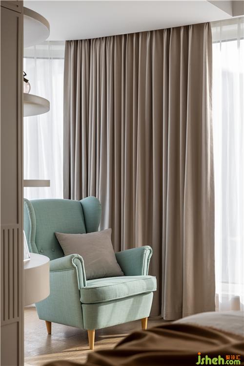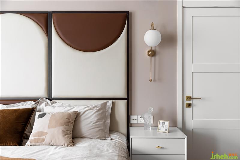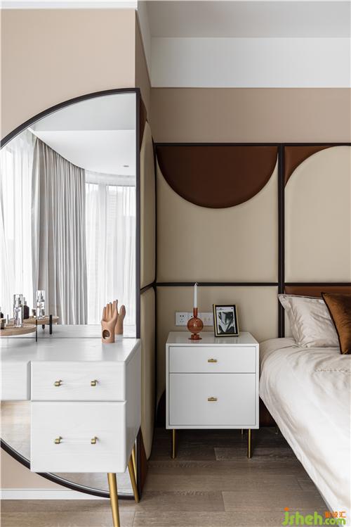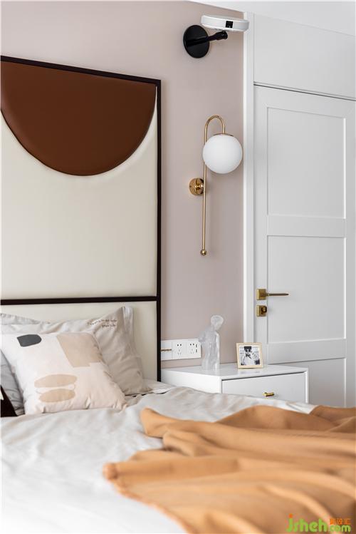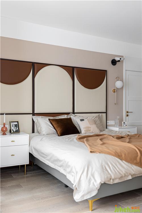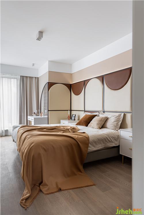 采用巧克力色與奶茶色做弧形拼色軟包床背景,裝修設(shè)計賦予空間一股復(fù)古與暖意.
