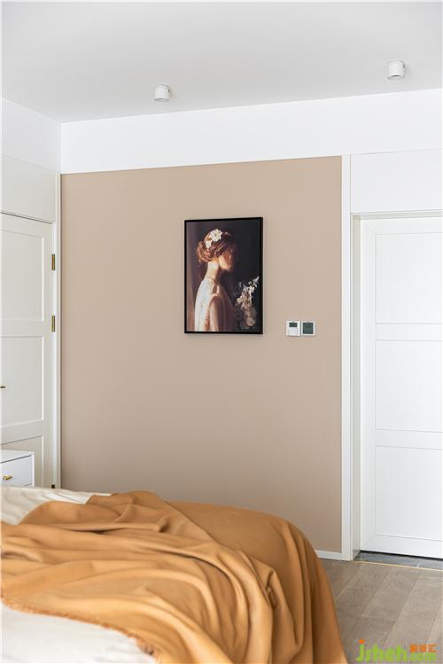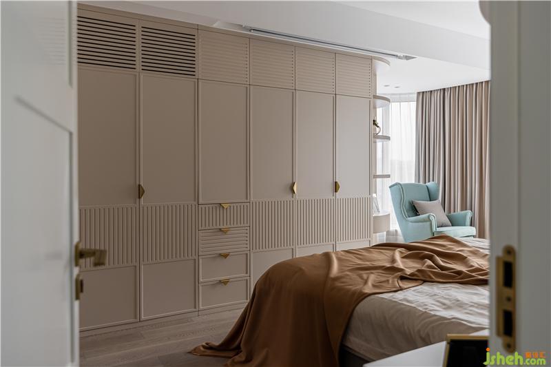 主臥取消電視背景墻,采用投影幕布,幕布后設(shè)置一整排衣柜,滿足儲物需求.
