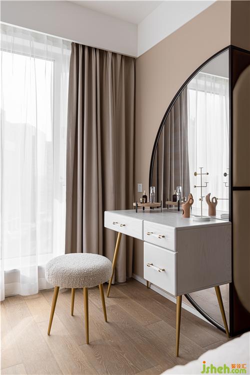 鏡面作為軟包背景造型的延伸,開闊視野的同時滿足女主人日常梳妝的需求.