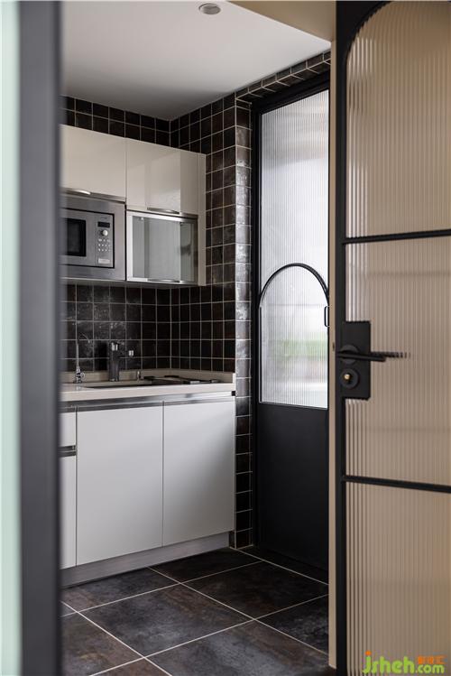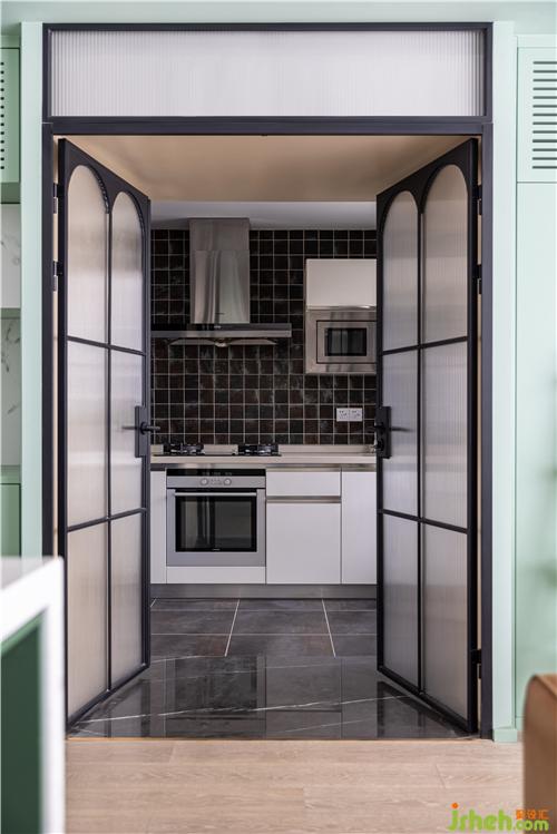 廚房保留原有狀態(tài),裝修設計定制弧形線條長虹玻璃黑色折疊門,造型復古典雅,與原廚房瓷磚相呼應.